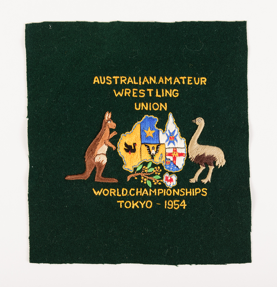 1954 WORLD CHAMPIONSHIPS: EMBROIDERED BADGE "AUSTRALIAN AMATEUR WRESTLING UNION/ (AUSTRALIAN COAT OF ARMS)/ WORLD CHAMPIONSHIPS, TOKYO - 1954".