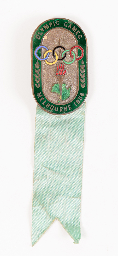 OFFICIAL BADGE FOR PRESS, MINTED BY K.G.LUKE, WITH GREEN ENAMEL BORDER, BRONZE BACKGROUND AND PALE GREEN RIBBON WITH "PRESS", NUMBERED "9576" ON REVERSE.