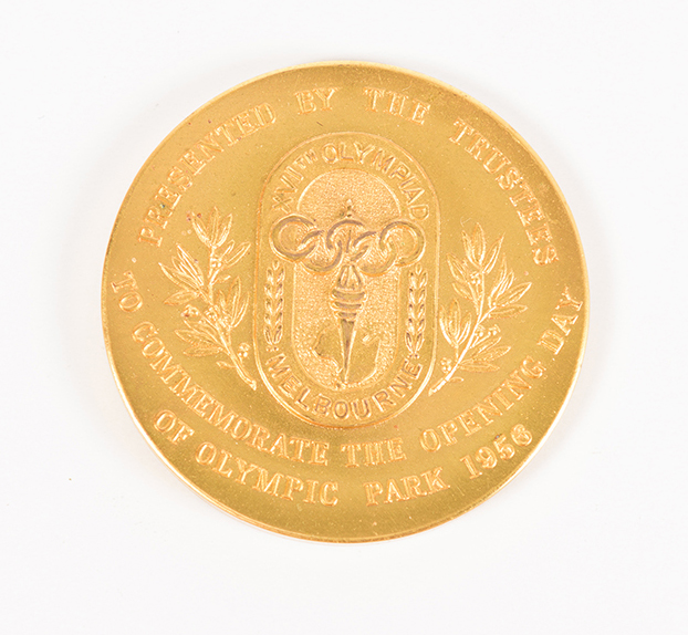 OLYMPIC PARK MEDAL: GOLD-COLOURED MEDAL "PRESENTED BY THE TRUSTEES/ (1956 MELBOURNE OLYMPICS LOGO)/ TO COMMEMORATE THE OPENING DAY/ OF OLYMPIC PARK 1956". MINTED BY K.G.LUKE.