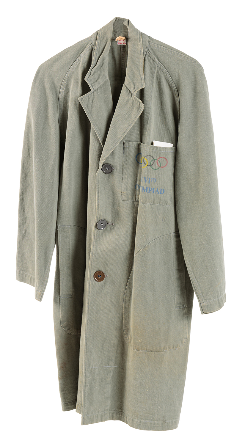 1956 MELBOURNE OLYMPICS: GREY DUST-COAT, WITH POCKET PRINTED WITH OLYMPIC RINGS IN COLOUR & TEXT "XVITH OLYMPIAD". SCARCE UNIFORM.