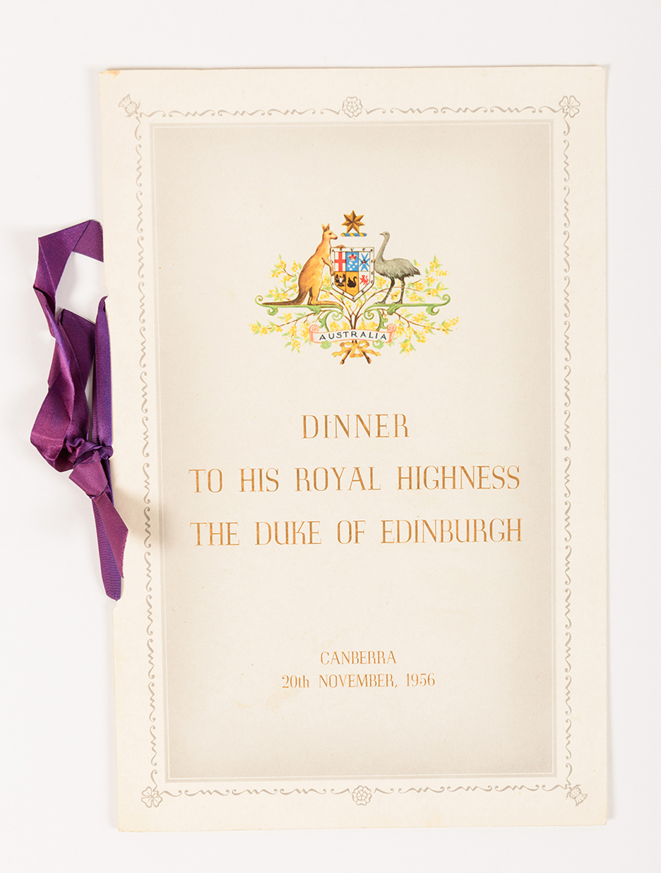 1956 MELBOURNE OLYMPICS: MENU "DINNER TO HIS ROYAL HIGHNESS THE DUKE OF EDINBURGH, CANBERRA, 20TH NOVEMBER, 1956".