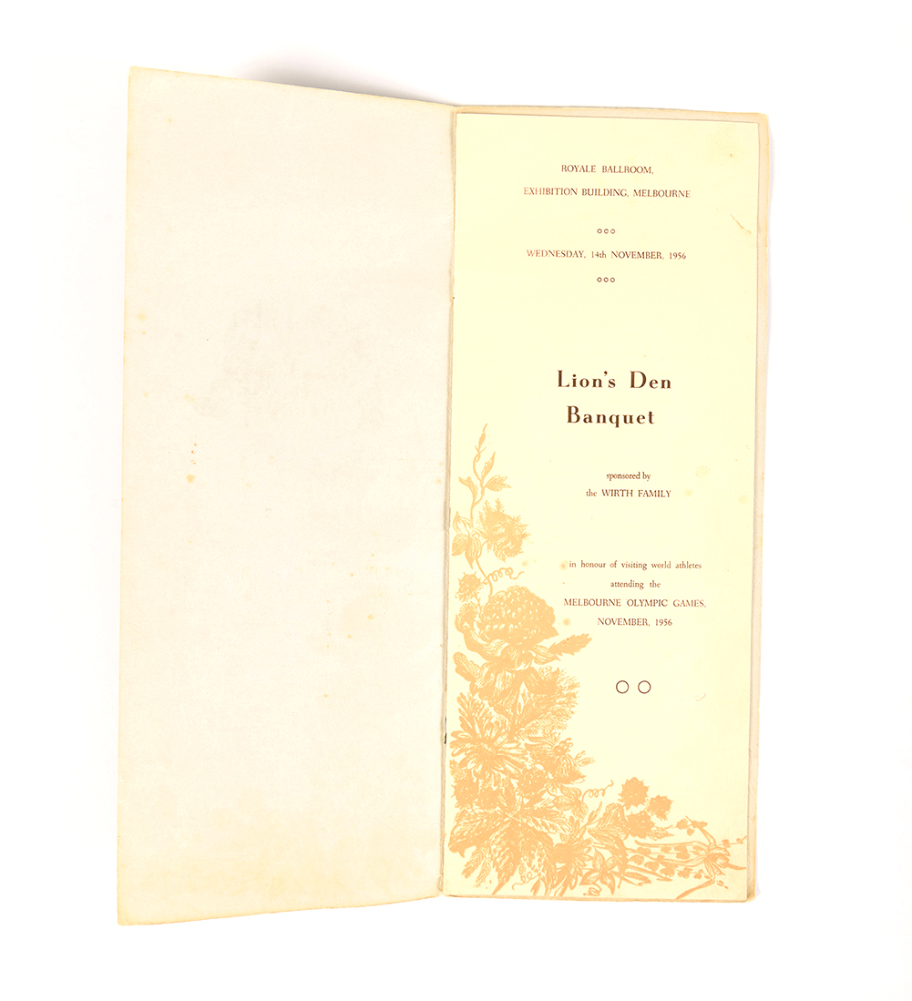 1956 MELBOURNE OLYMPICS: MENU "LION'S DEN BANQUET, IN HONOUR OF VISITING WORLD ATHLETES ATTENDING THE MELBOURNE OLYMPIC GAMES, NOVEMBER, 1956", SPONSORED BY THE WIRTH (CIRCUS) FAMILY. FAIR CONDITION.