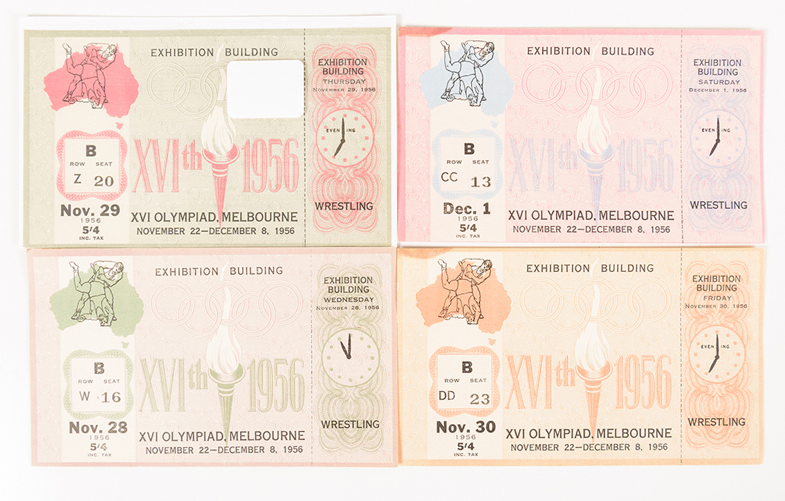 1956 MELBOURNE OLYMPICS: TICKETS FOR WRESTLING AT EXHIBITION BUILDINGS - THE 4 DAYS OF THE GRECO-ROMAN WRESTLING.