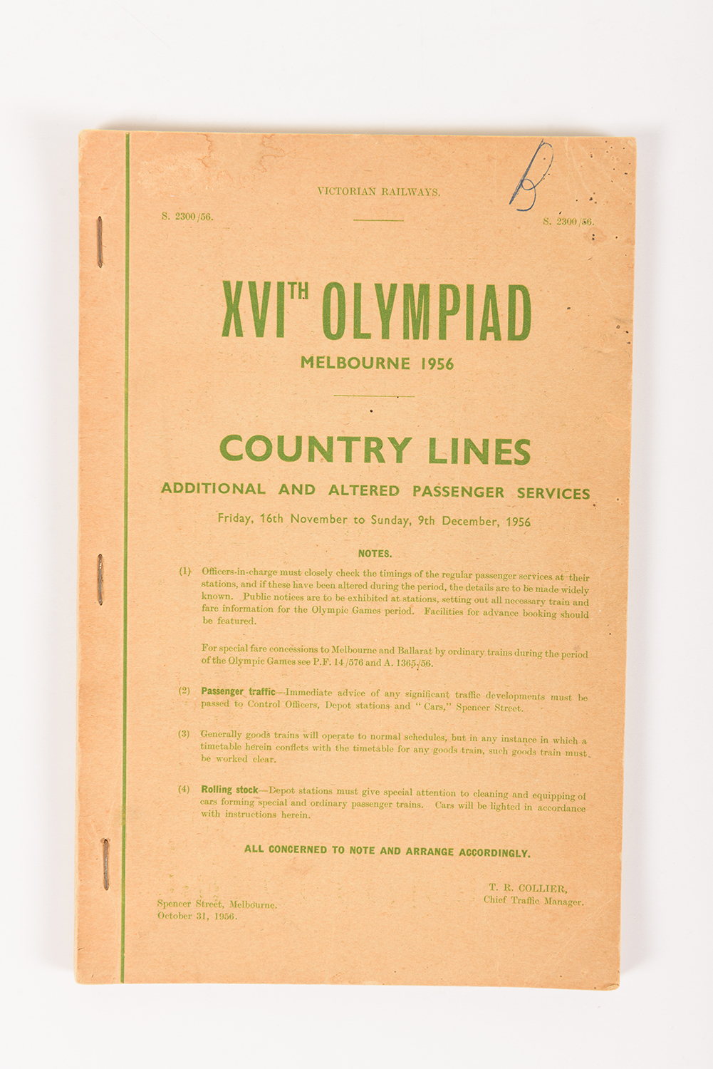 1956 MELBOURNE OLYMPICS: "VICTORIAN RAILWAYS. XVITH OLYMPIAD, MELBOURNE 1956. COUNTRY LINES ADDITIONAL AND ALTERED PASSENGER SERVICES", COMPREHENSIVE TIMETABLE, 96 PAGES.