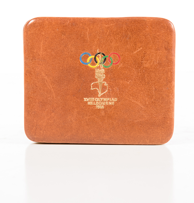 1956 MELBOURNE OLYMPICS: CIGARETTE CASE, KANGAROO SKIN, WITH OLYMPIC RINGS, TORCH & "XVITH OLYMPIAD, MELBOURNE 1956" ON FRONT, MADE BY DOMO.