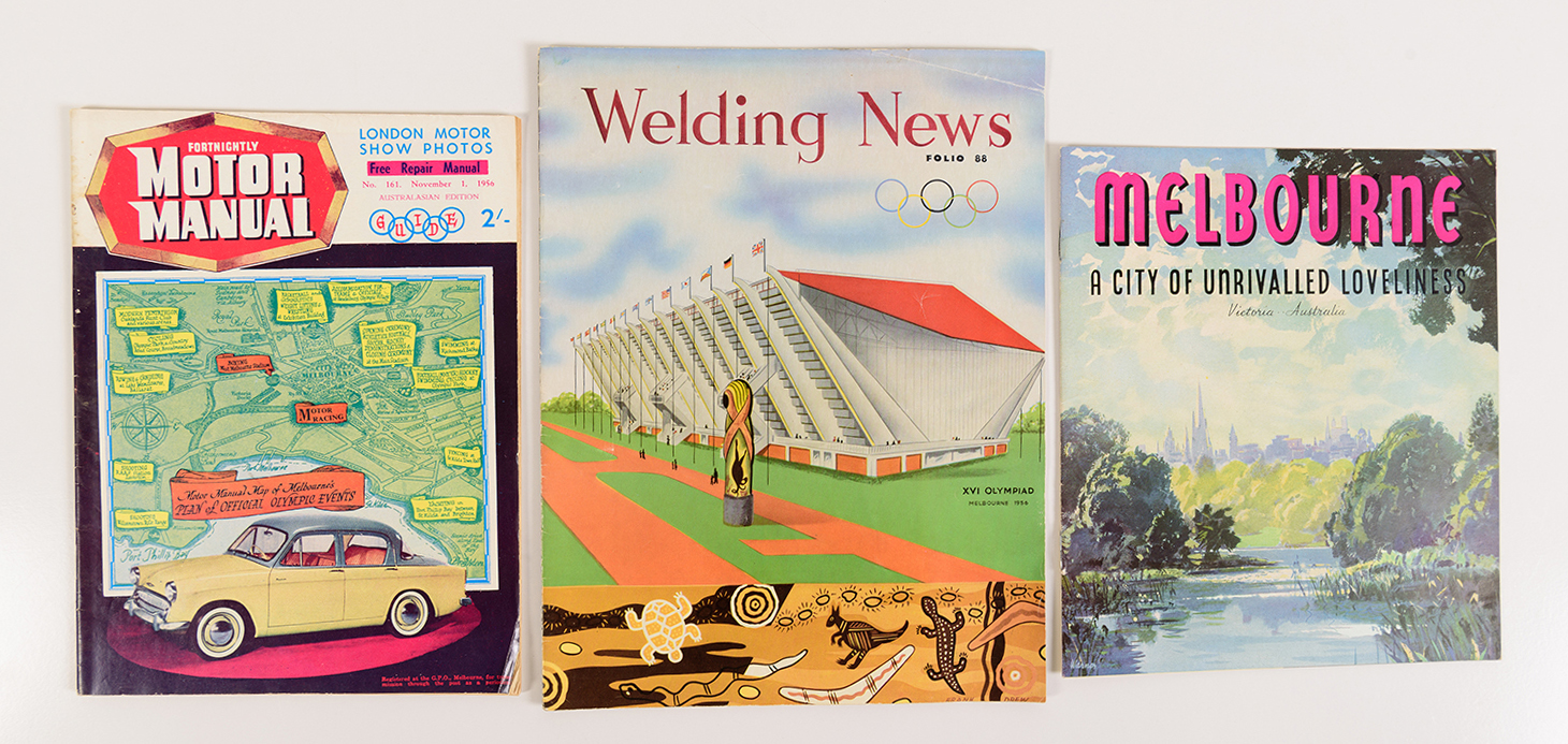 1956 MELBOURNE OLYMPICS: BOOKLETS & MAGAZINES (12 ITEMS), NOTED "MOTOR MANUAL" & "WELDING NEWS".