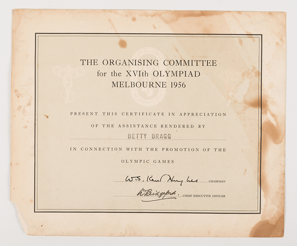 1956 MELBOURNE OLYMPICS: CERTIFICATE OF APPRECIATION FROM THE ORGANISING COMMITTEE TO BETTY BRAGG. POOR/FAIR CONDITION.