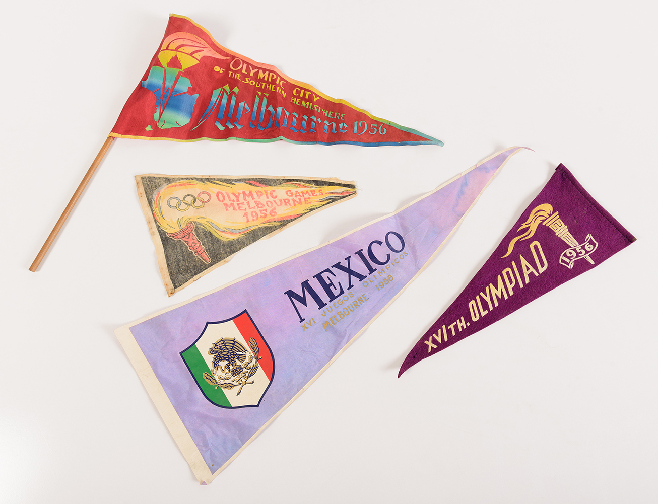 1956 MELBOURNE OLYMPICS: COLLECTION OF PENNANTS (13), NOTED TEAM PENNANTS FOR ARGENTINA, MEXICO & VENEZUELA. POOR/GOOD CONDITION.