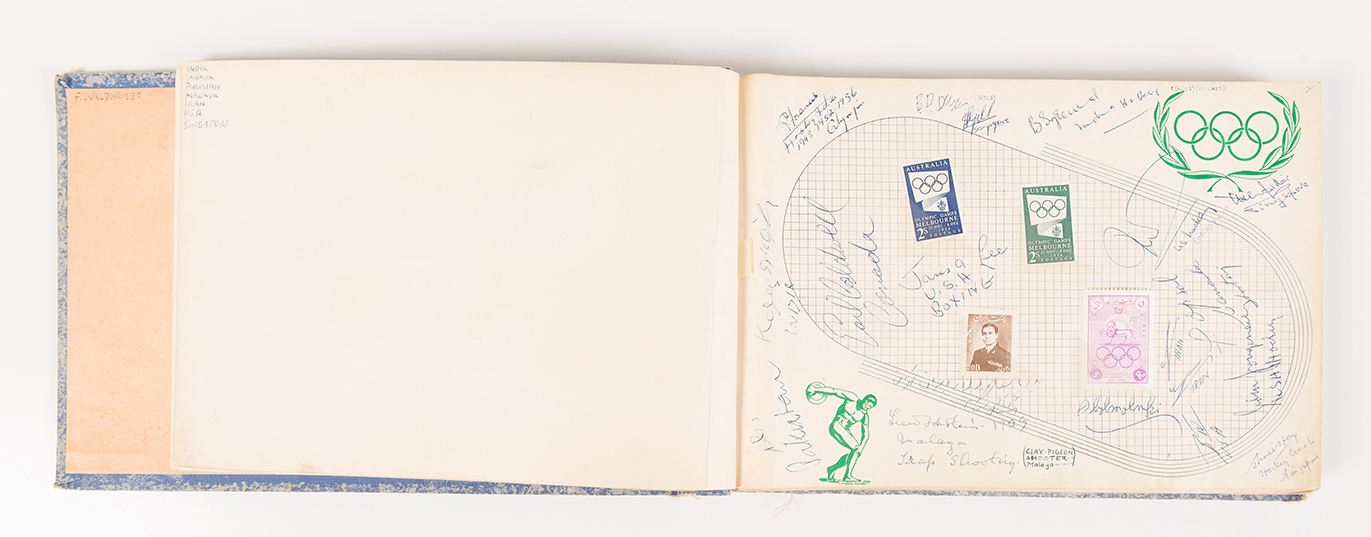 1956 MELBOURNE OLYMPICS: AUTOGRAPH BOOK CONTAINING 225+ SIGNATURES, AND 147 STAMPS.