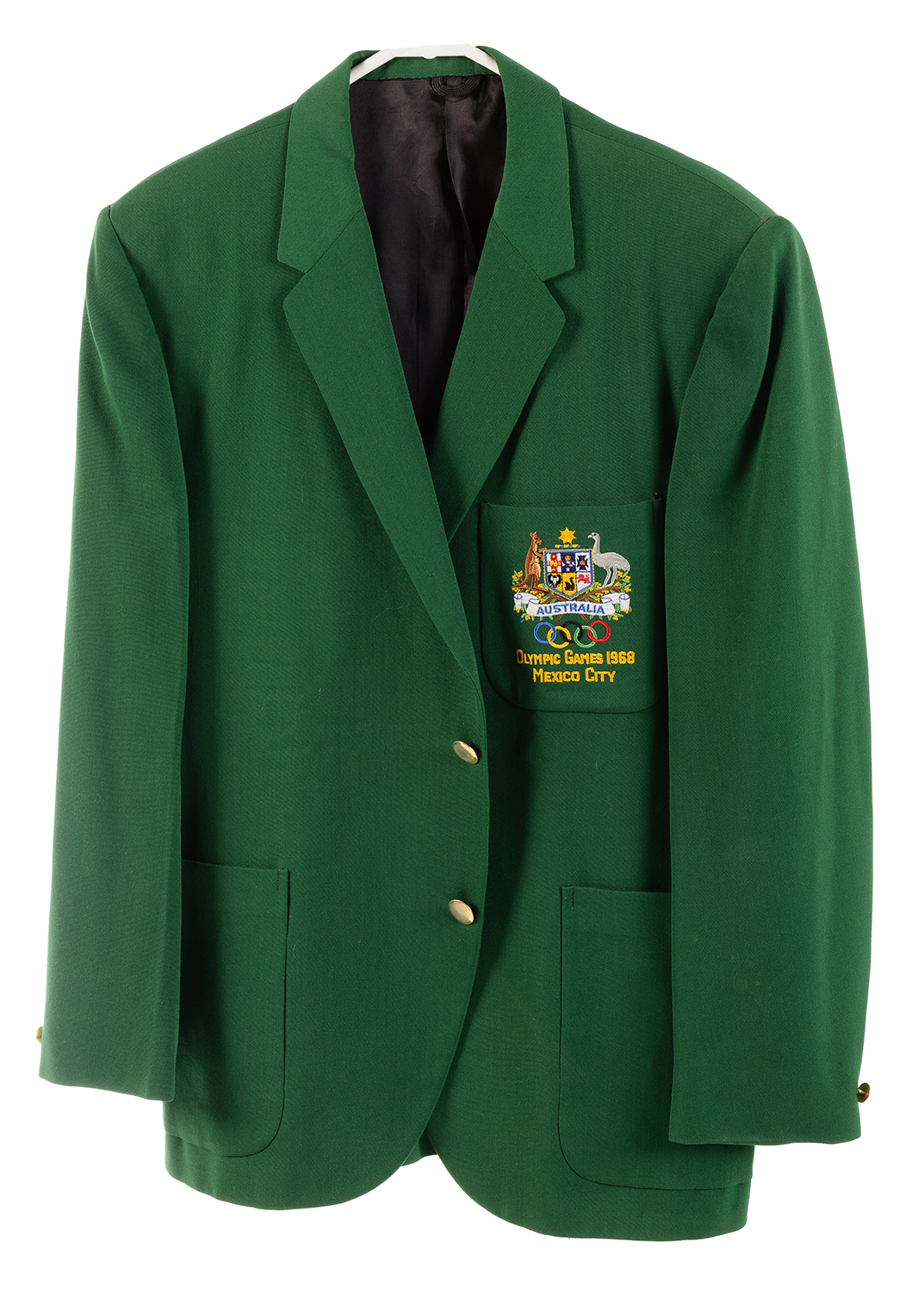 1968 MEXICO OLYMPICS: AUSTRALIAN BLAZER, GREEN WOOL WITH AUSTRALIAN COAT-OF-ARMS, OLYMPIC RINGS & "OLYMPIC GAMES 1968/ MEXICO CITY" ON POCKET. GOOD CONDITION.