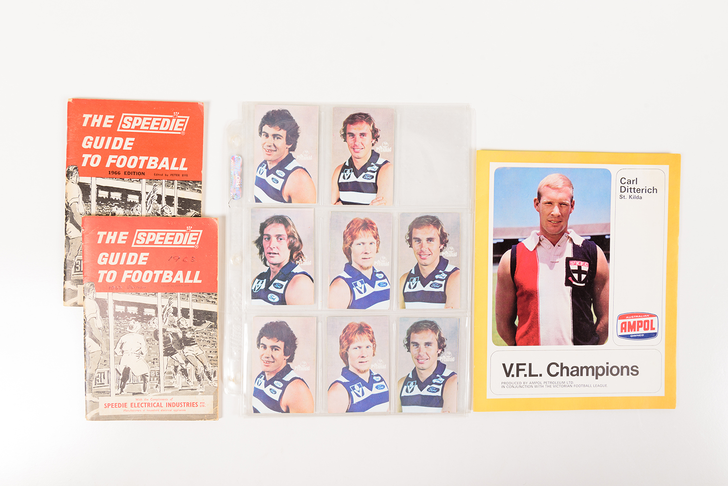 FOOTBALL EPHEMERA (45 ITEMS), NOTED "THE SPEEDIE GUIDE TO FOOTBALL" 1963 & 1966 EDITIONS; FEW FOOTBALL CARDS & VFL PARK BADGES.