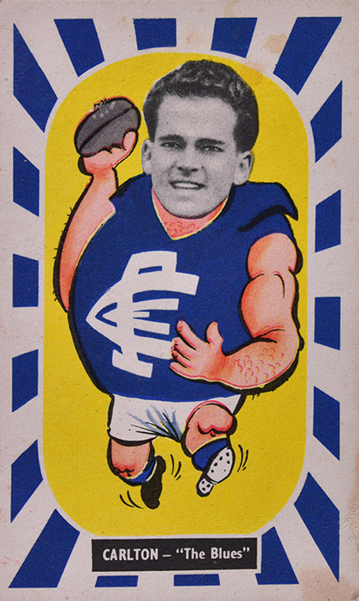 1957 KORNIES "FOOTBALLER - MASCOT SWAP CARDS" [1/36] - NO.27 JOHN JAMES (CARLTON). G/VG.