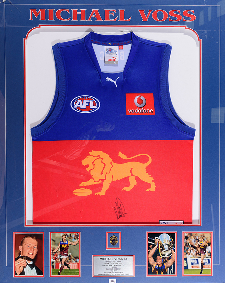 BRISBANE: DISPLAY WITH JUMPER SIGNED MICHAEL VOSS WITH REPLICA BROWNLOW; FRAMED PHOTO SIGNED DANIEL RICH; PHOTOS (3) SIGNED JONATHON BROWN, DANIEL RICH & TRAVIS JOHNSON.