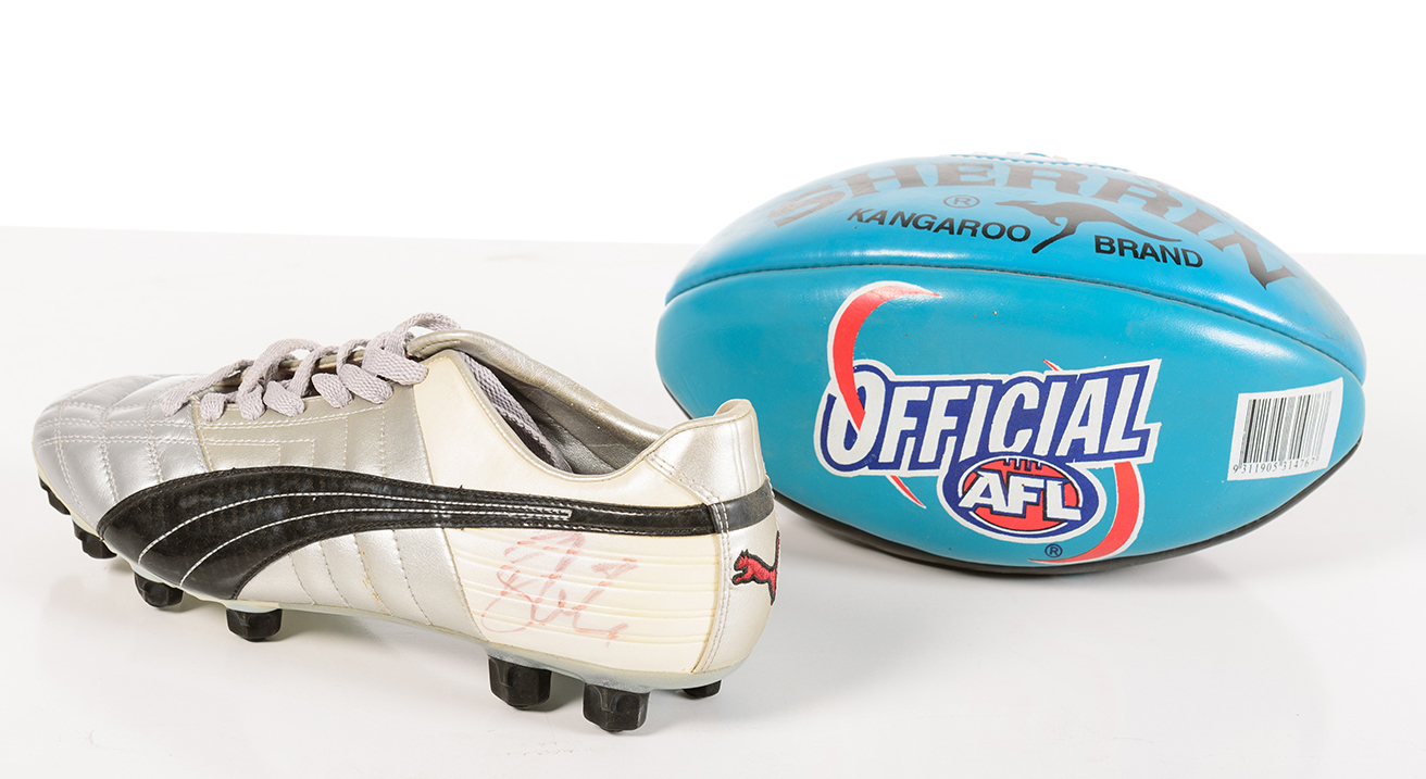 SIGNED ITEMS: FOOTBALL BOOT SIGNED BEN COUSINS; FOOTBALLS (3) SIGNED E.J.WHITTEN LEGENDS GAME, JOEL SELWOOD & GAVIN WANGANEEN; PHOTO SIGNED DAVID MUNDY; UNSIGNED PHOTO GARY ABLETT JR.
