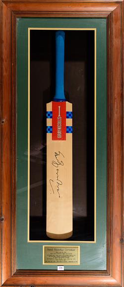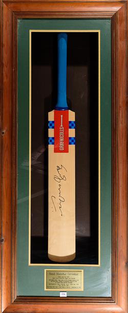 SUNIL GAVASKAR, SIGNED CRICKET BAT, IN ATTRACTIVE DISPLAY CASE, OVERALL 49X115CM.