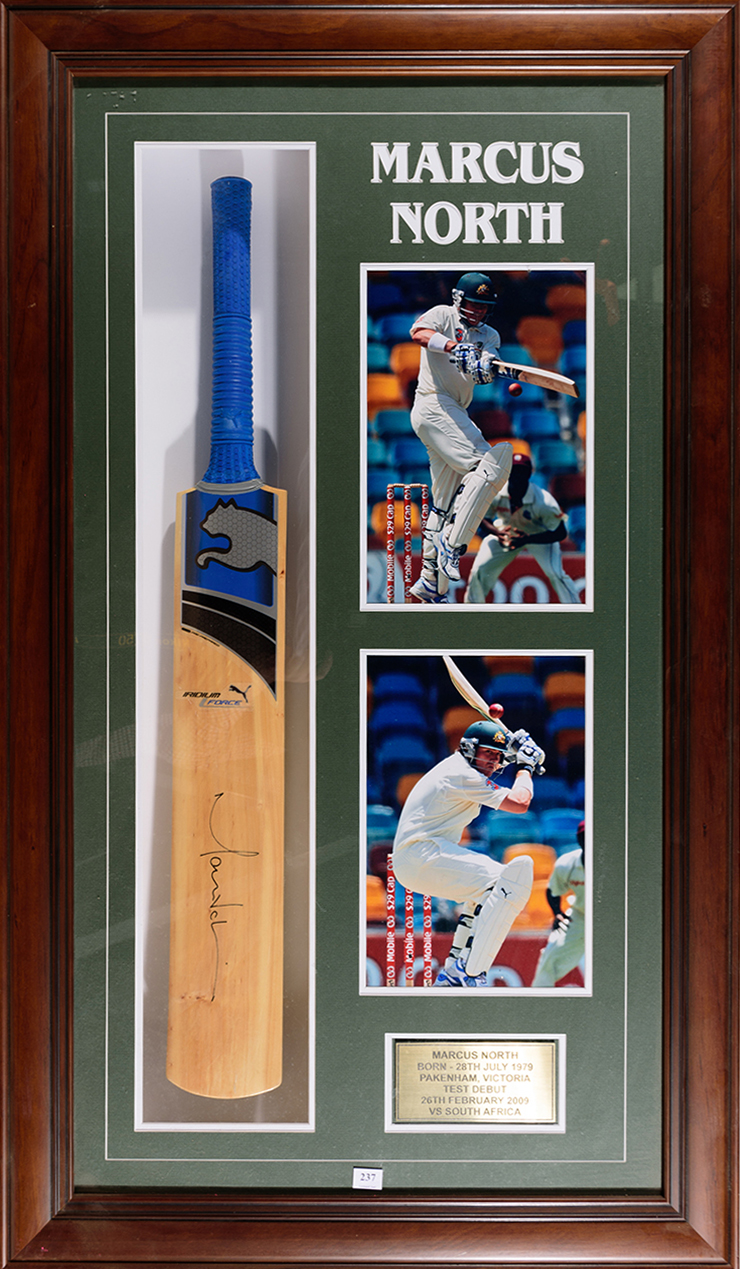 MARCUS NORTH, SIGNED CRICKET BAT, IN ATTRACTIVE DISPLAY CASE, OVERALL 64X110CM.