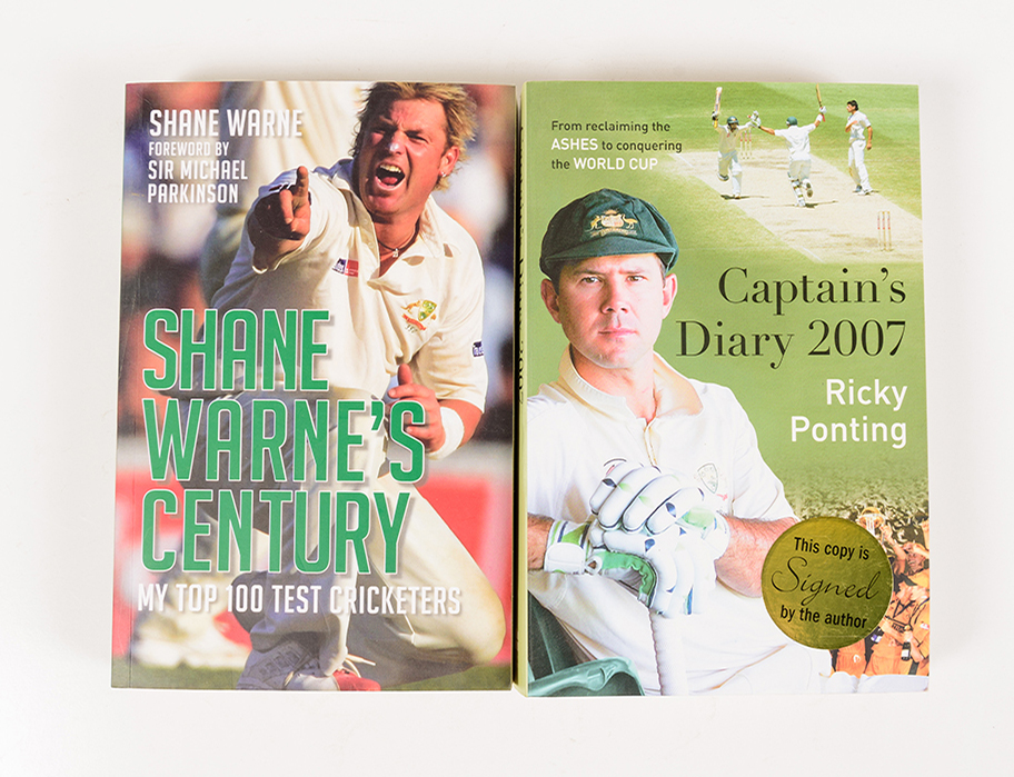 SIGNED CRICKET BOOKS (8), NOTED RICKY PONTING (2), SHANE WARNE, MAX WALKER, DAVID BOON, STEVE WAUGH, MIKE HUSSEY & ANDREW SYMONDS.