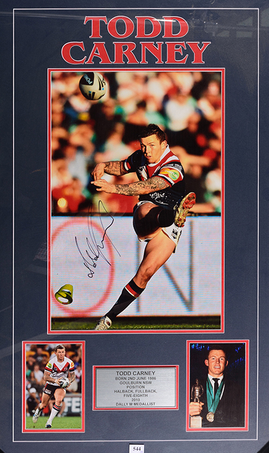 NRL: SIGNED DISPLAYS OF TODD CARNEY (2) , BENJI MARSHALL & BRETT STEWART; PLUS BOOK SIGNED ANDREW JOHNS.