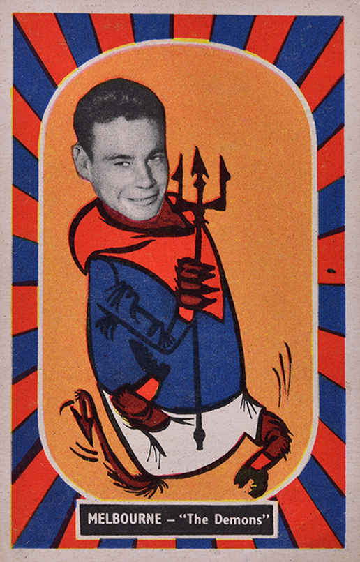 1957 KORNIES "FOOTBALLER - MASCOT SWAP CARDS" [1/36] - NO.3 RON BARASSI (MELBOURNE). G/VG.