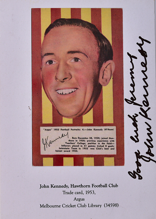 1953 ARGUS "1953 FOOTBALL PORTRAITS", COMPLETE SET OF HAWTHORN PLAYERS [6/72]; PLUS 2008 NATIONAL SPORTS MUSEUM POSTCARD SIGNED JOHN KENNEDY. MAINLY G/VG.
