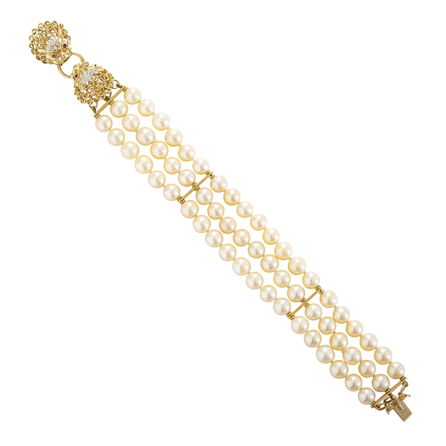 Comprising three rows of uniform pearls measuring 7.5mm, to a diamond and ruby dragon head clasp in 14ct gold, total length 220mm.