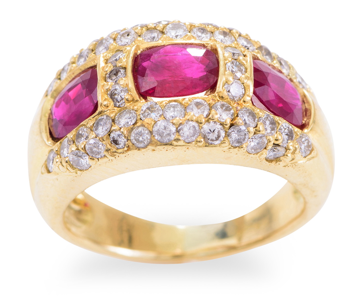 Comprising three oval faceted rubies totalling 1.80cts, surrounded by small diamonds, mounted in 18ct gold, ring size I.