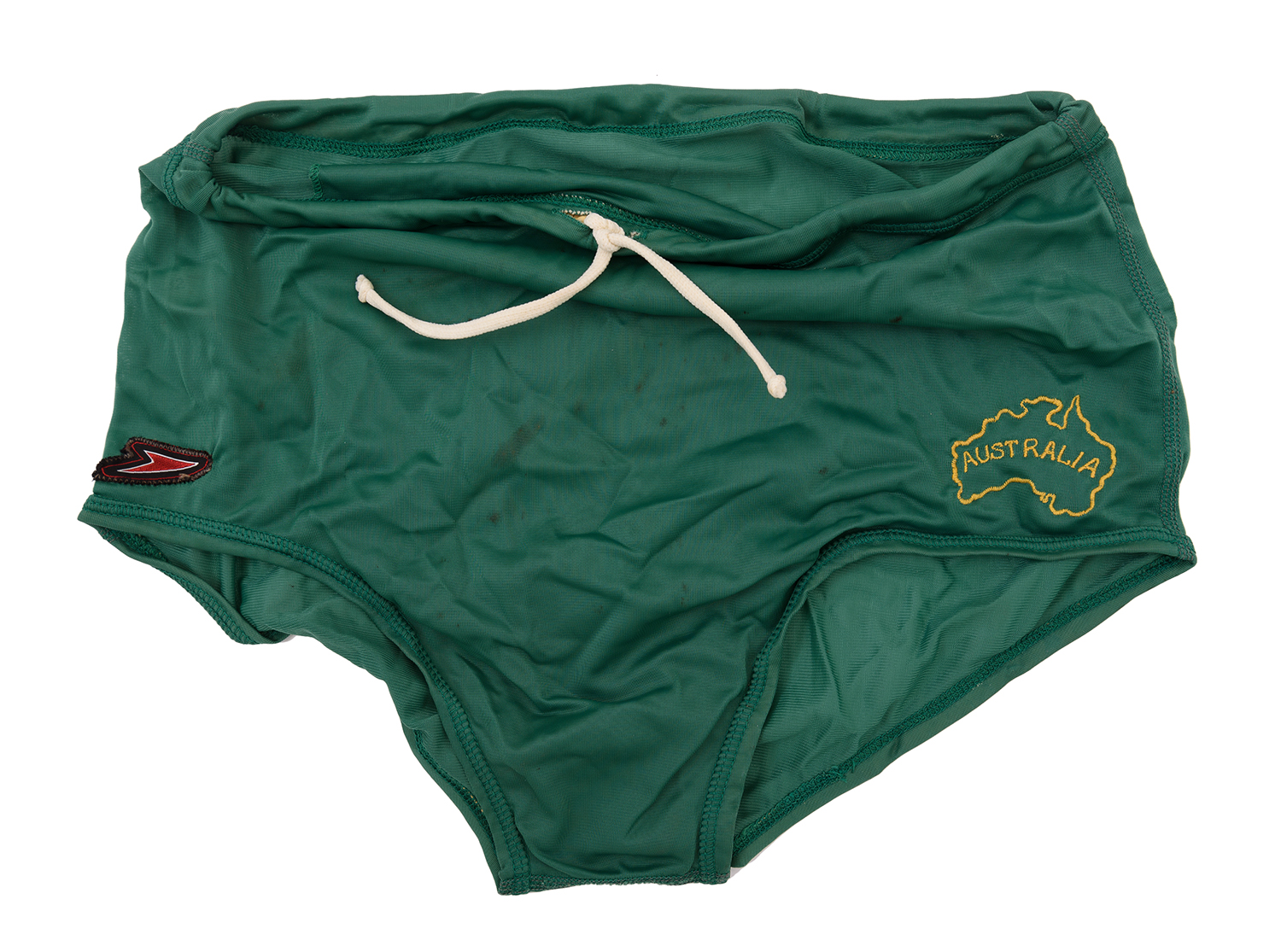MURRAY ROSE''S WORN SWIMMING TRUNKS 1956 MELBOURNE OLYMPICS, WITH EMBROIDERED AUSTRALIA INSIDE MAP