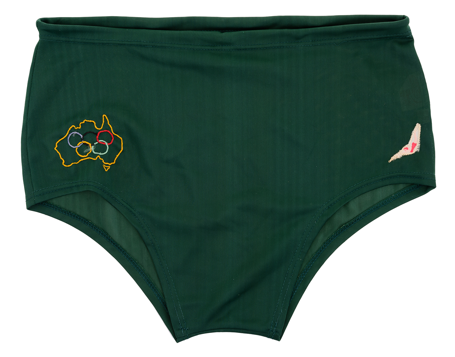 MURRAY ROSE'S SWIMMING TRUNKS 1960 ROME OLYMPICS, WITH EMBROIDERED OLYMPIC RINGS INSIDE MAP