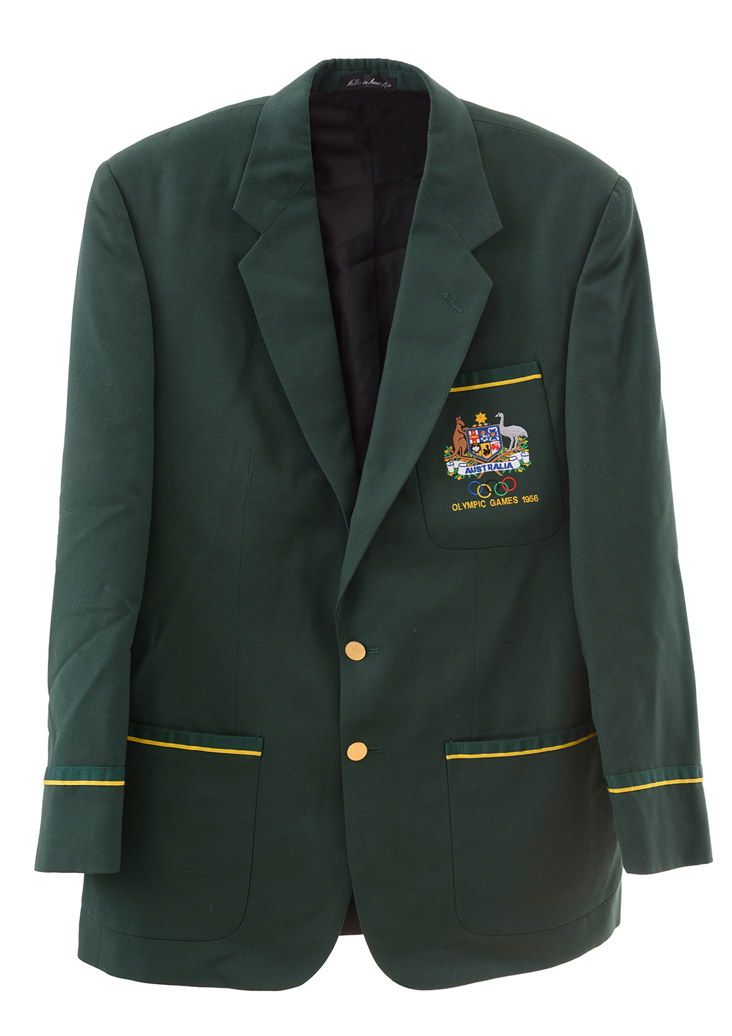 MURRAY ROSE'S OLYMPICS BLAZER WITH AUSTRALIAN COAT OF ARMS, OLYMPIC RINGS & "OLYMPIC GAMES 1956" EMBROIDERED ON ON POCKET, MADE LATER TO WEAR TO OLYMPIC EVENTS