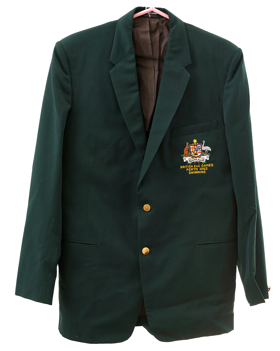MURRAY ROSE'S 1962 COMMONWEALTH GAMES BLAZER WITH AUSTRALIAN COAT OF ARMS AND "BRITISH E&C GAMES, PERTH 1962, SWIMMING" EMBROIDERED ON ON POCKET