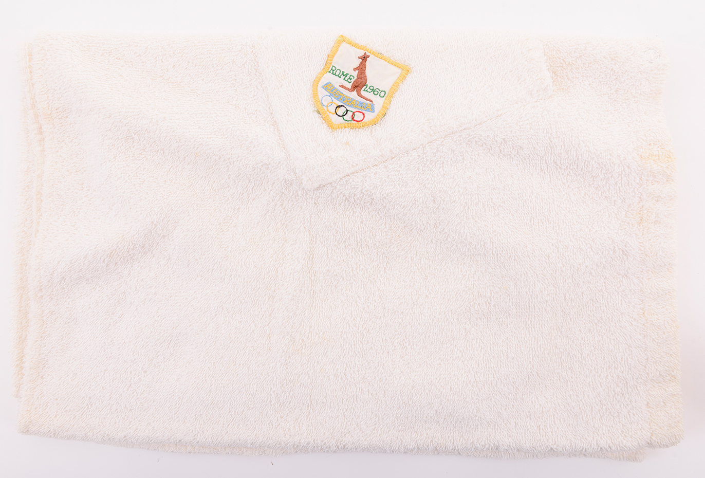 MURRAY ROSE'S LAP-TOWEL, WHITE WITH BADGE "KANGAROO ROME 1960, AUSTRALIA, OLYMPIC RINGS", MADE BY JOCKEY