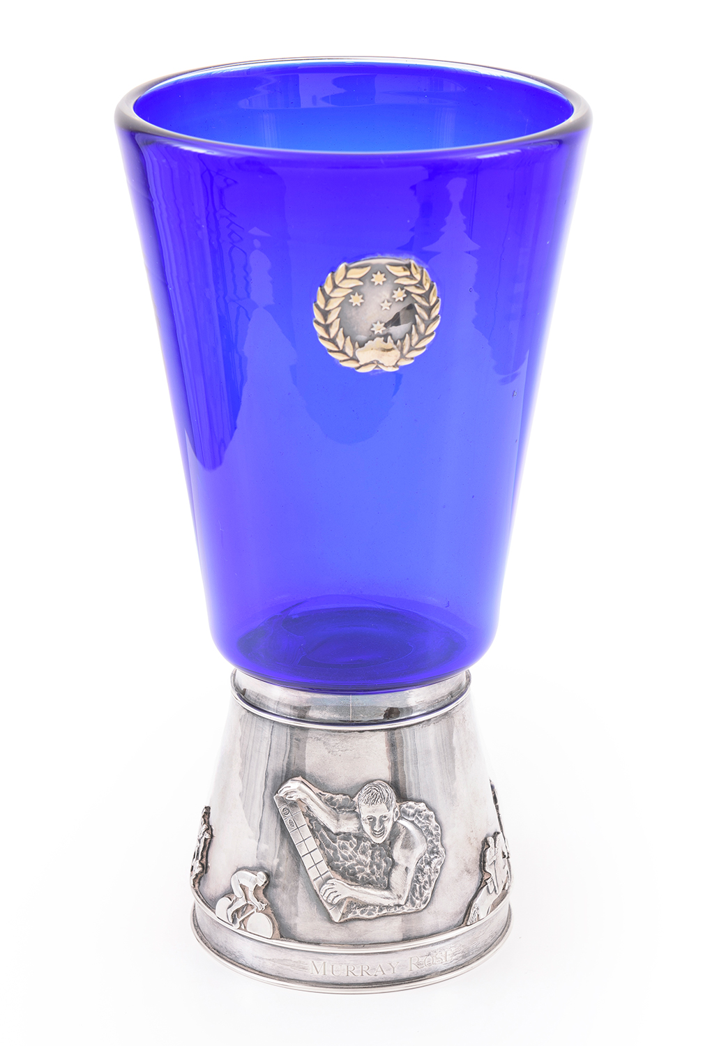 MURRAY ROSE'S SPORT AUSTRALIA HALL OF FAME TROPHY, BLUE GLASS WITH SILVER BASE, PERSONALISED WITH RELIEF SCULPTURE OF SWIMMER & ENGRAVED "MURRAY ROSE/ THE SPORT AUSTRALIA HALL OF FAME LEGEND 1999". MADE BY PETER GERTLER, GOLD & SILVERSMITH.