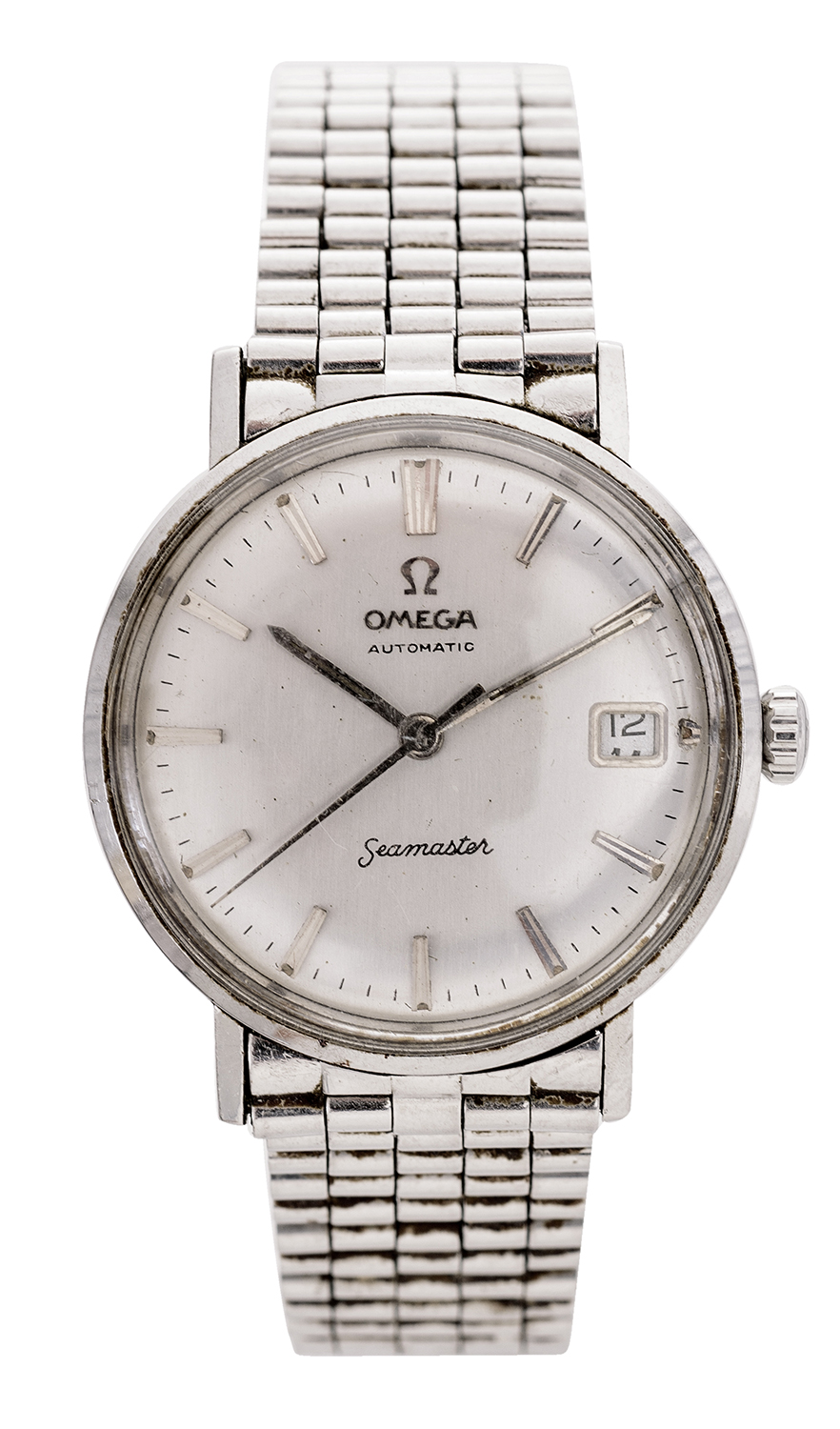 Omega-Automatic Seamaster. Baton numerals and date aperture at three. Stainless steel case and bands. Not recently serviced or timed. Ticking at the time of assessment. Minor scratches, some foxing and grit to dial. Minor surface scratches to case. Bands worn and slightly streched.