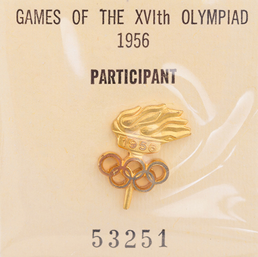 MURRAY ROSE'S IOC OLYMPIC PARTICIPANT'S BADGE: OLYMPIC TORCH BADGE DATED "1956", AFFIXED TO CARD "GAMES OF THE XVIth OLYMPIAD, 1956, PARTICIPANT, 53251", IN WHITE PRESENTATION WALLET WITH OLYMPIC RINGS ON FRONT.