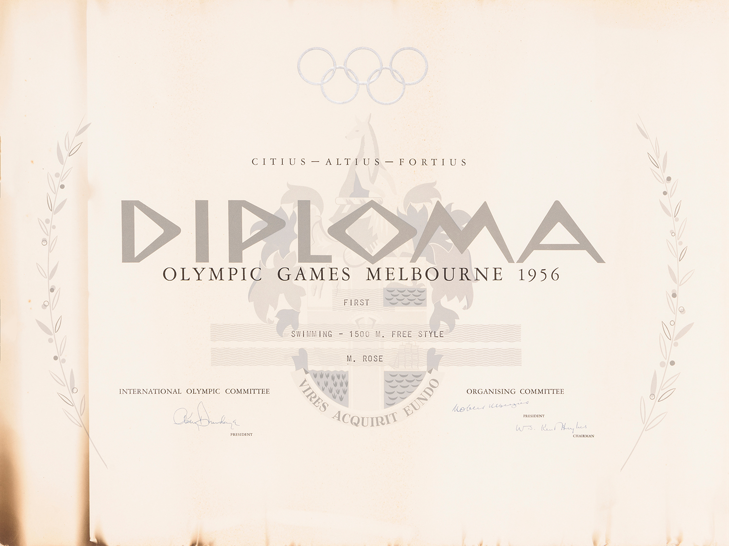 MURRAY ROSE'S GOLD MEDAL DIPLOMA, WITH "DIPLOMA, OLYMPIC GAMES MELBOURNE 1956/ FIRST, SWIMMING - 1500 M. FREE STYLE, M.ROSE". MINOR SMOKE STAINING.