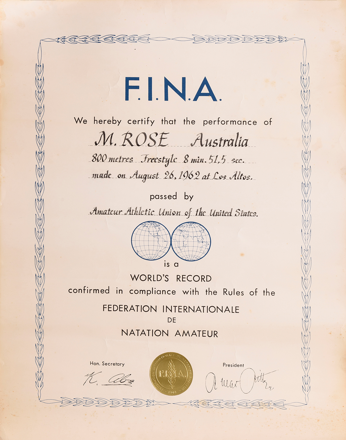 MURRAY ROSE'S FINA WORLD RECORD CERTIFICATE, AWARDED TO "M.ROSE, AUSTRALIA. 800 METRES FREESTYLE, 8 MIN. 51,5 SEC. MADE ON AUGUST 26, 1962 AT LOS ALTOS.