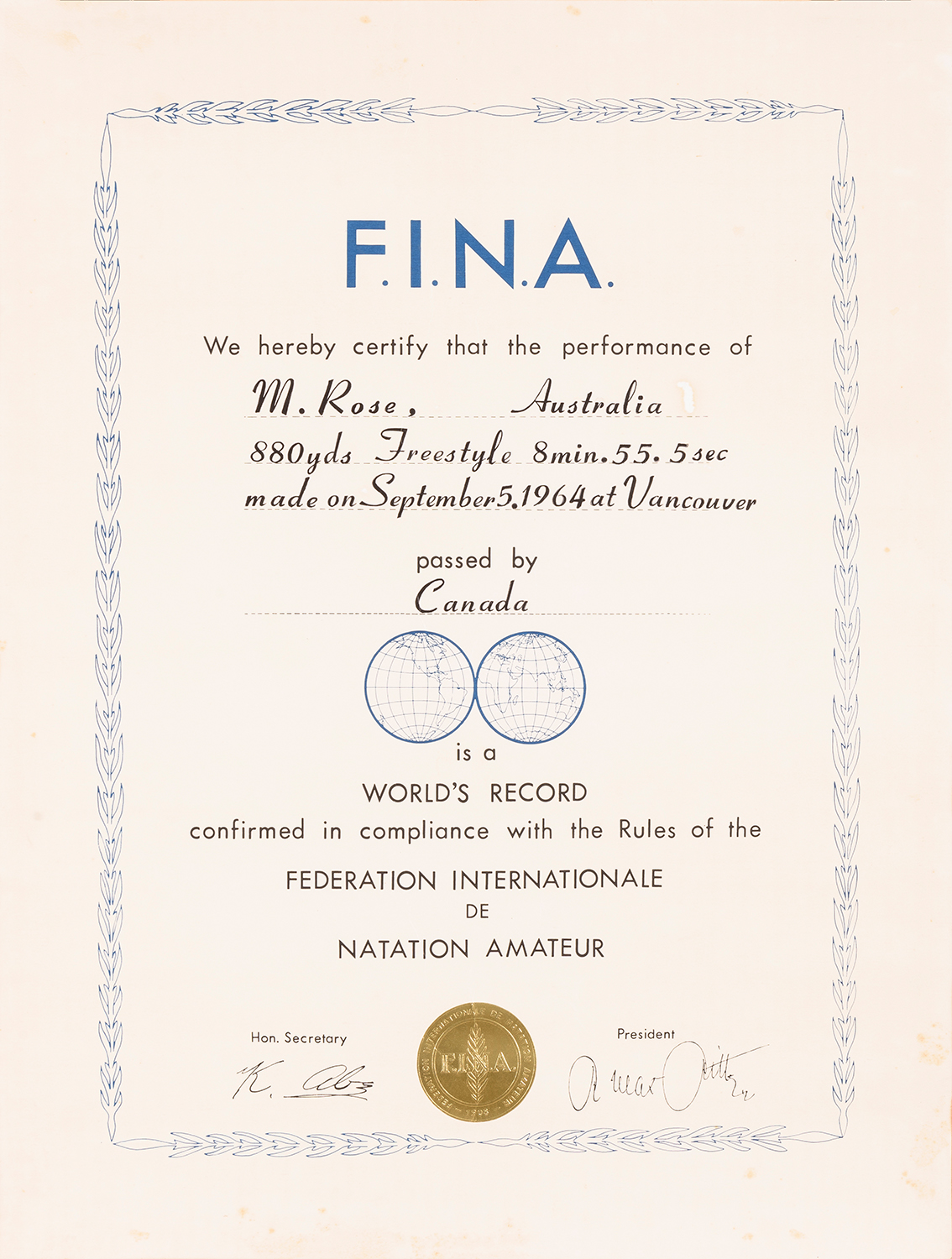 MURRAY ROSE'S FINA WORLD RECORD CERTIFICATE, AWARDED TO "M.ROSE, AUSTRALIA. 880 YDS FREESTYLE, 8 MIN. 55.5 SEC. MADE ON SEPTEMBER 5, 1964 AT VANCOUVER.