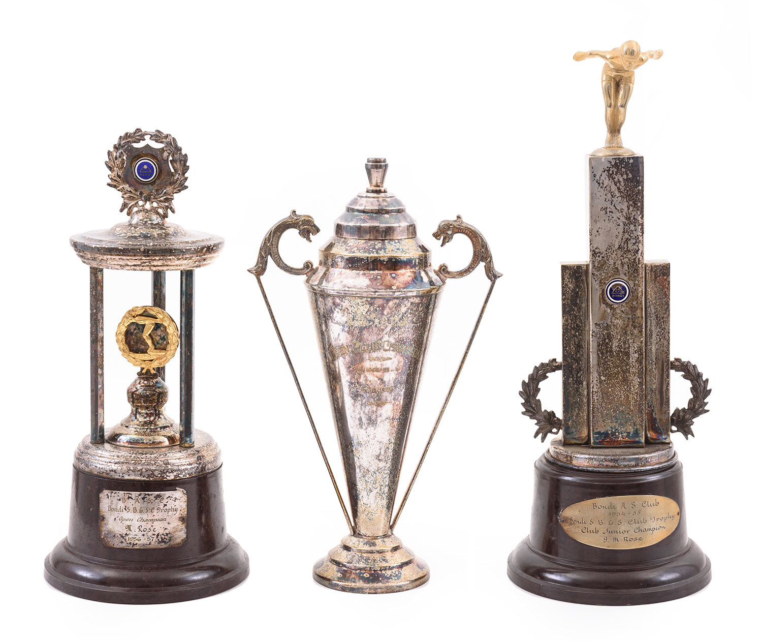 MURRAY ROSE'S BONDI AMATUER SWIMMING CLUB TROPHIES, NOTED PLAQUES FOR 1952-53, 1953-54, 1954-55, 1955-56 & 1956-57, CELEBRATING CLUB, STATE, AUSTRALIAN & WORLD RECORDS; CLUB CHAMPION TROPHIES (4); OTHER TROPHIES (11); TRAY; BOOKS (3) & SUGAR BOWL.