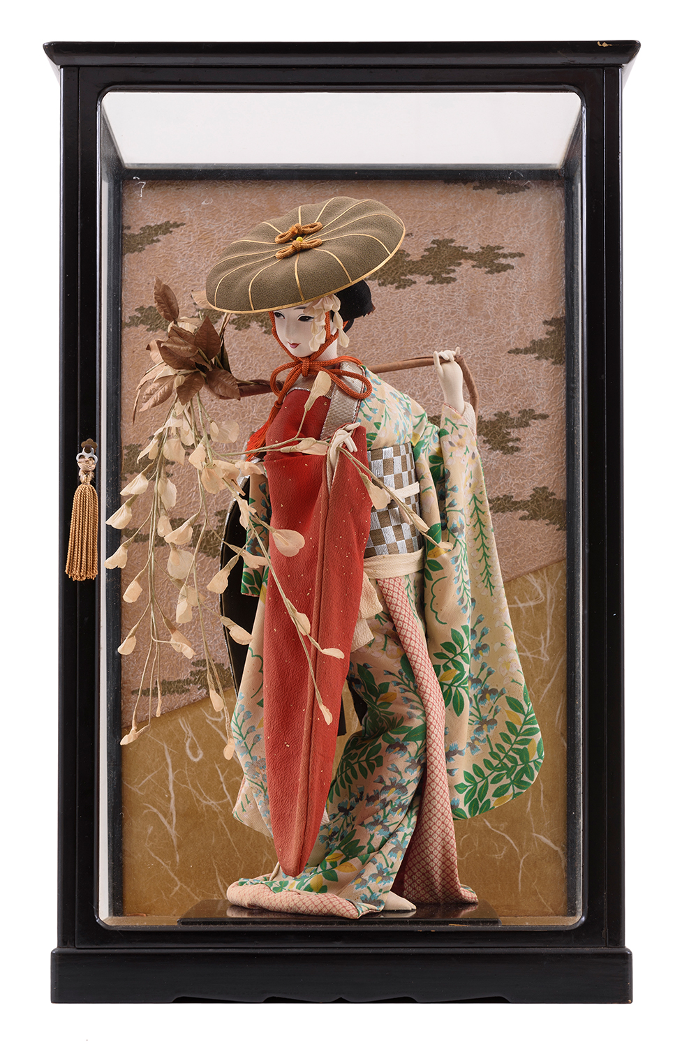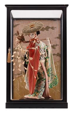 MURRAY ROSE'S 1959 TRIP TO JAPAN: GROUP WITH JAPANESE DOLL IN CASE (WITH PHOTO OF PRESENTATION TO SWIMMERS); PHOTO ALBUM WITH 54 PHOTOGRAPHS; LARGE SWIMMING TROPHY; MEDALS (4); FLYING FISH PLAQUE; SAKE SET; FANS (7), OTHER SOUVENIRS.