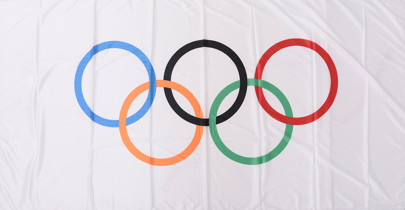 OLYMPIC FLAG, USED TO DRAPE MURRAY ROSE'S CASKET AT HIS FUNERAL, 23 APRIL 2012. TOGETHER WITH ORDER OF SERVICE BOOKLET.