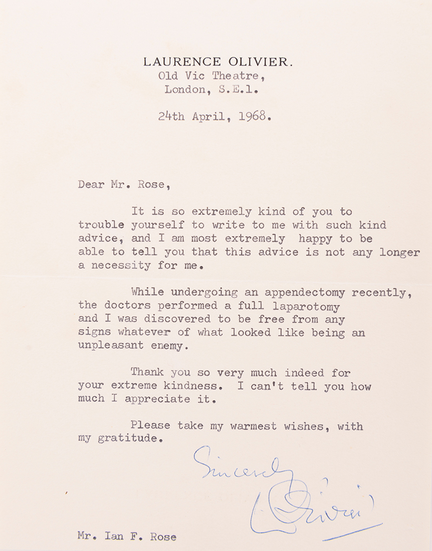 LAURENCE OLIVIER, NICE SIGNATURE ON 1968 LETTER TO MURRAY'S FATHER.