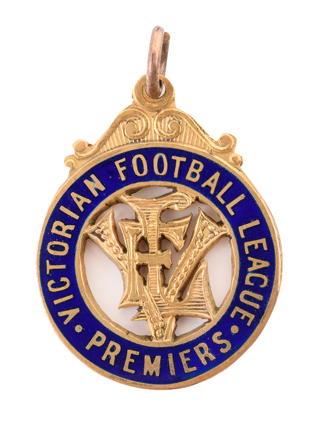 1933 SOUTH MELBOURNE PREMIERSHIP MEDAL, SOLID GOLD AND BLUE ENAMEL, WITH "VFL" IN CENTRE SURROUNDED BY TEXT "VICTORIAN FOOTBALL LEAGUE/ PREMIERS", ENGRAVED ON REVERSE "SOUTH MELB.F.C./ F.BACKWAY".