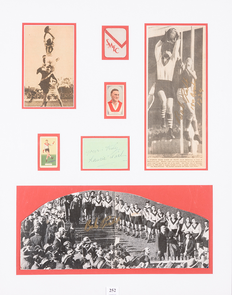 SOUTH MELBOURNE: DISPLAY WITH SIGNATURES OF BOB PRATT (2) & LAURIE NASH, WINDOW MOUNTED, FRAMED & GLAZED, OVERALL 56X69CM.