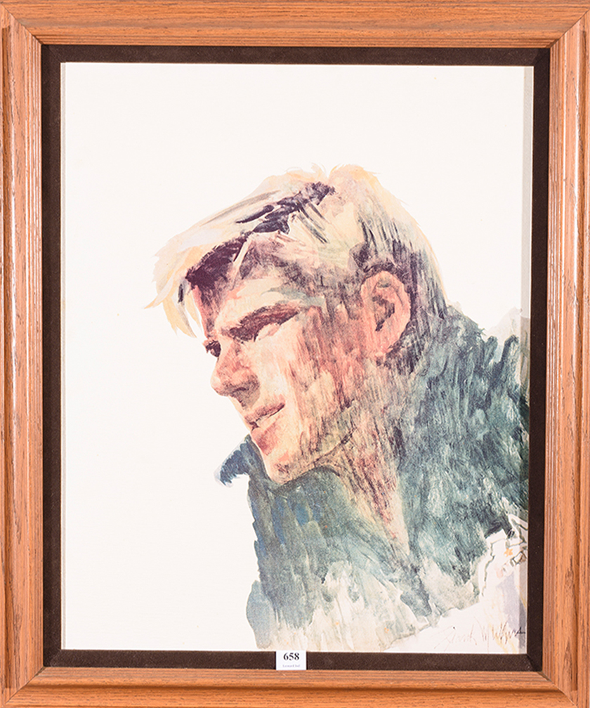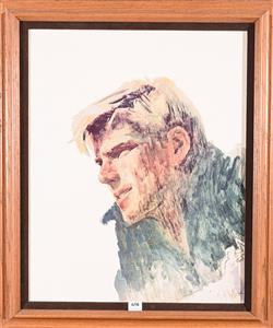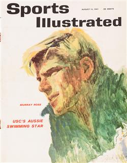 PRINT OF FRANK MULLINS' ARTWORK OF MURRAY ROSE, USED FOR THE COVER OF 'SPORTS ILLUSTRATED' IN AUG.1961, FRAMED & GLAZED, OVERALL 51X62CM. WITH COPY OF ORIGINAL MAGAZINE. [ORIGINAL PAINTING WAS DESTROYED IN A FIRE AT HIS MOTHER'S HOME IN HOLLYWOOD, CA. REPLACED THROUGH THE ARTIST & 'SPORTS ILLUSTRATED']