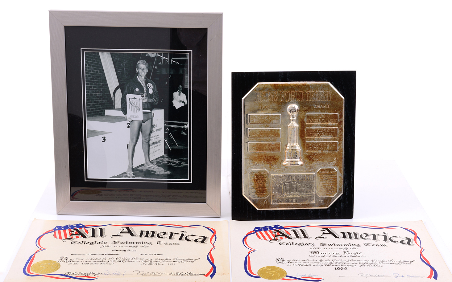 MURRAY ROSE AT COLLEGE IN AMERICA: GROUP WITH AMERICAN RECORD CERTIFICATES (20); ALL AMERICA COLLEGIATE SWIMMING TEAM CERTIFICATES (11); TROPHIES (6); HELMS WORLD TROPHY AWARD 1962; BELT BUCKLES (2); CERTIFICATES (4); PHOTOS (13) & LETTERS.