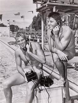 TOBRUK MEMORIAL BATHS, TOWNSVILLE - 1956 OLYMPIC SWIM TEAM TRAINING CAMP: TWO HAND-PAINTED COCONUTS, EACH WITH SIGNATURES OF ABOUT 20 SWIMMERS FROM AUSTRALIA, USA, MEXICO, JAPAN & RUSSIA. TOGETHER WITH PHOTOGRAPHS (5). [SIX WORLD RECORDS WERE SET THERE IN ONE NIGHT IN 1956]. ALSO COCONUT HAND-PAINTED BY SCHOOLCHILDREN DURING 2000 REUNION.