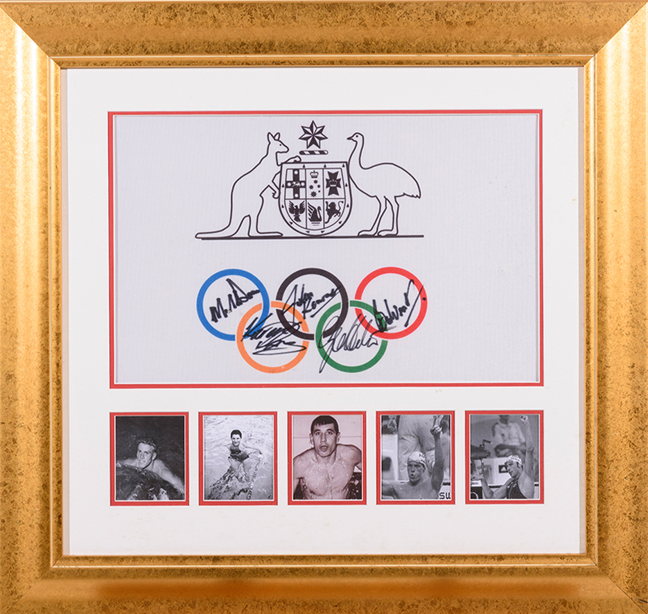 AUSTRALIAN OLYMPIC COMMITTEE PENNANT WITH 5 SIGNATURES INCLUDING MURRAY ROSE, JOHN KONRADS, KIEREN PERKINS & GRANT HACKETT, FRAMED & GLAZED, OVERALL 67X65CM.
