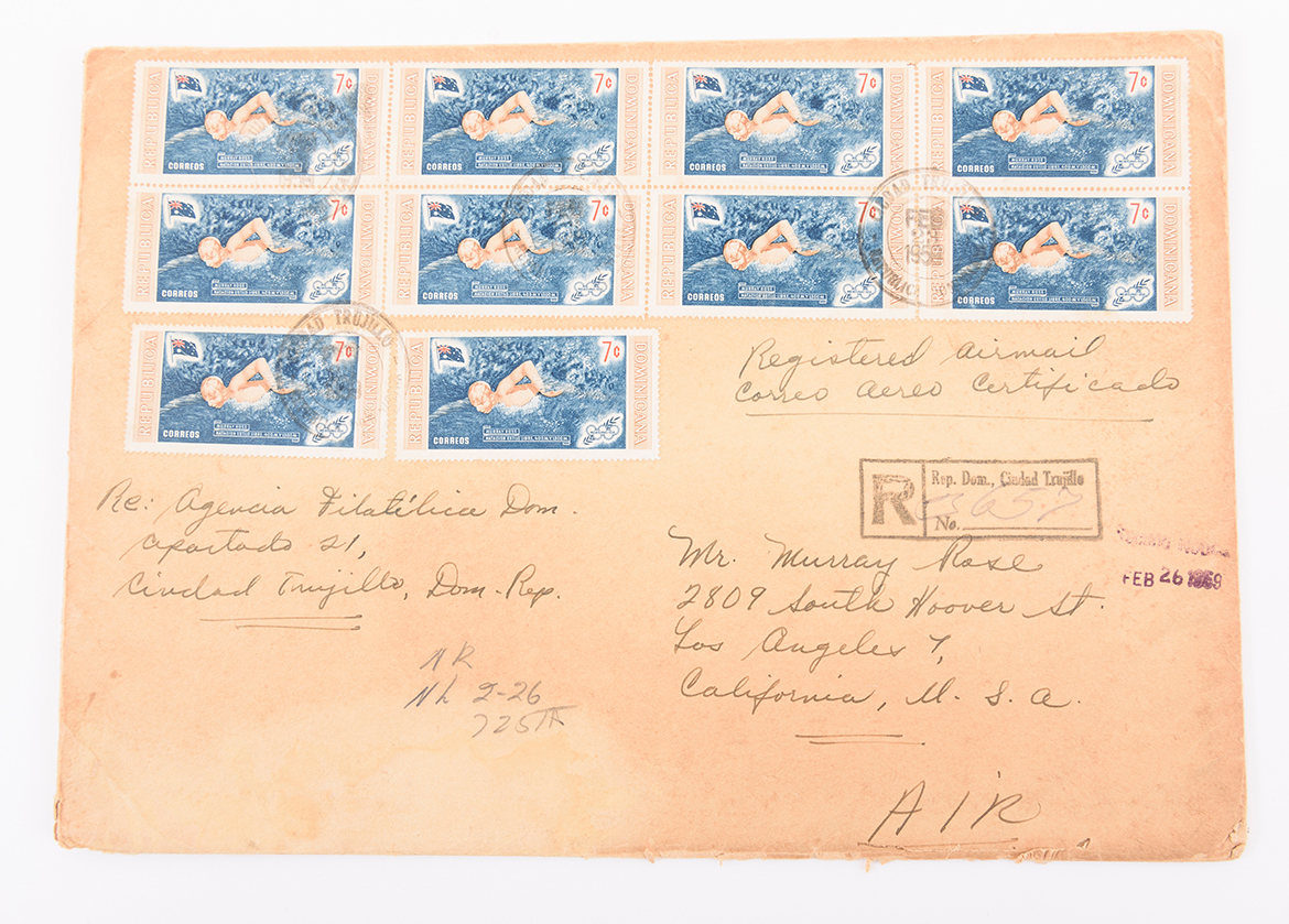 STAMPS GROUP, NOTED DOMINICAN REPUBLIC 7C MURRAY ROSE STAMP SHEET OF 50; REGISTERED COVER TO MURRAY FRANKED 10 OF HIS STAMPS; OTHER COVERS (3).
