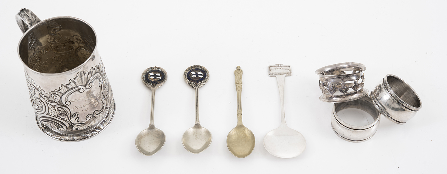 comprising a 18th century sterling silver christening cup, a sterling thistle decorated napkin ring, four silver plate teaspoons and a pair of silver plate napkin rings