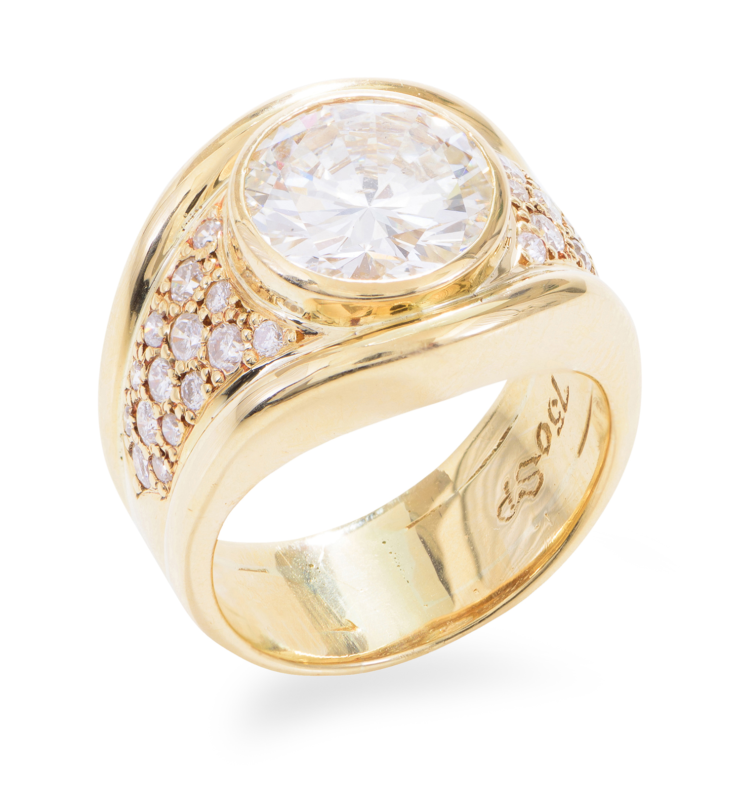 Ring presents in excellent condition with stones all secure in their settings. Principal diamond has been graded in its mount which is bezel set in yellow gold making it difficult to provide accurate colour and clarity grading, colour K-L, clarity SI2. Pave set shoulder stones are colour G, clarity VS. Total weight 10.8gms.